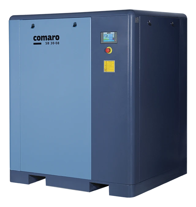 Компрессоры COMARO серии SB на ременном приводе в широком диапазоне мощностей 7,5-90 кВт давно зарекомендовали себя на рынке в качестве очень надежного оборудования в условиях эксплуатации с повышенной нагрузкой - Компрессоры имеют увеличенные размеры корпуса, унифицированные сразу для нескольких мощностей - Компрессоры оснащены многофункциональной сенсорной системой управления COMCON - Используется шесть размеров винтовой пары для оптимальной работы на каждой мощности и давлении - Установлена оптимизированная система охлаждения для тяжелых условий работы компрессора - Действует складская программа на всем диапазоне мощностей на 8 и 10 бар