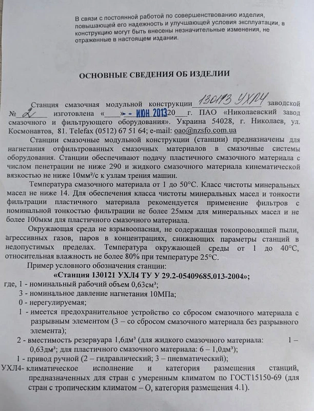 Станция смазочная модульной конструкции 130113, изготовлена ПАО "Николаевский завод смазочного и фильтрующего оборудования", г. Николаев,  Украина.