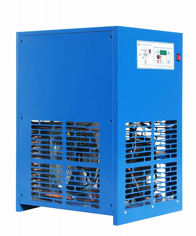 Работа осушителя осуществляется за счет конденсации влаги на холодной поверхности. Контур теплообменника «Воздух-воздух» охлаждает горячий воздух. Второй контур теплообменника «Воздух-фреон» понижает температуру сжатого воздуха до установленной температуры точки росы. Пары воды конденсируются и впоследствии отделяются из воздуха. Полученный конденсат собирается в сепараторе и удаляется через блок слива конденсата. Компрессор обеспечивает циркуляцию хладагента по фреоновому контуру осушителя.