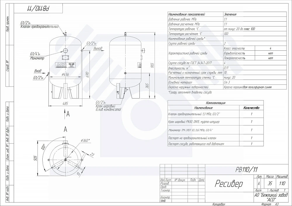 Комплектация воздушного ресивера РВ110/11: